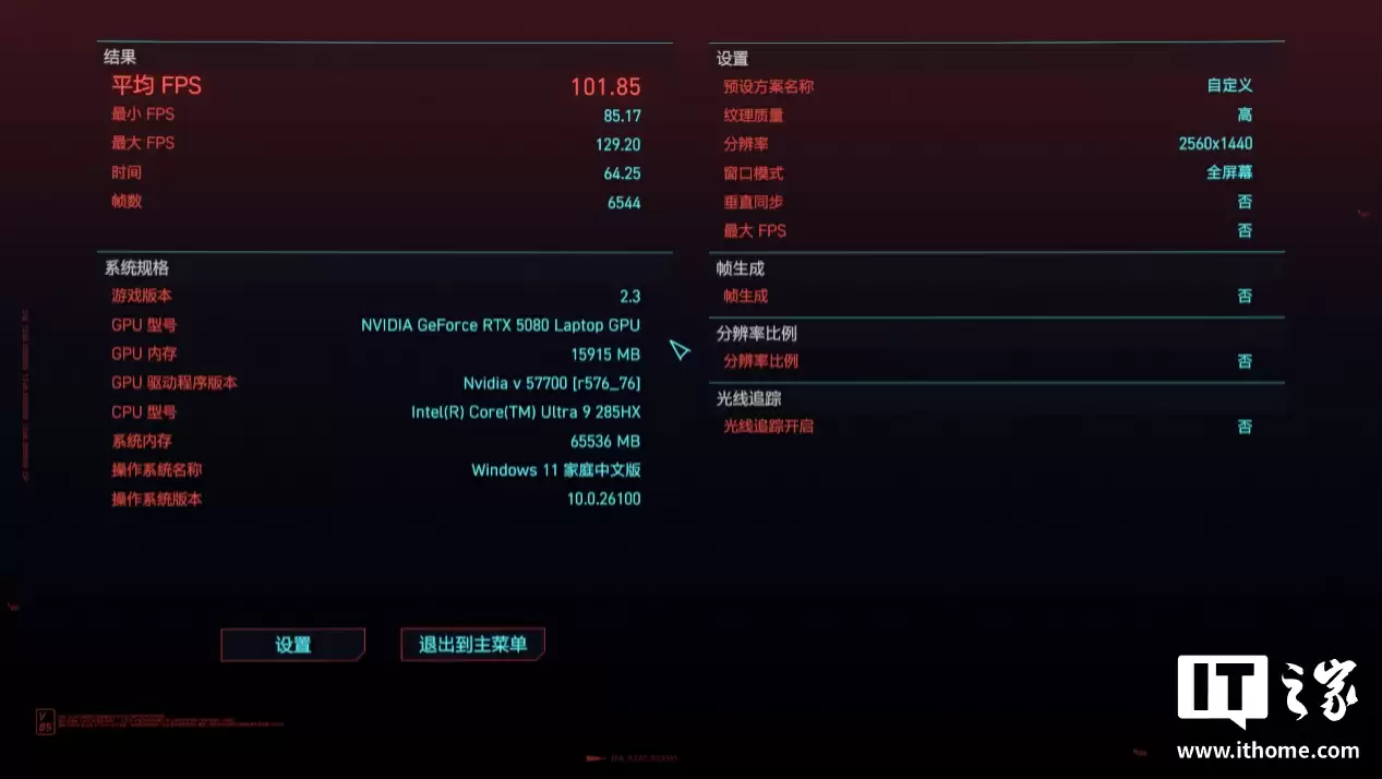 在 2K 高画质下游戏平均帧数 140 帧,1% Low 帧 65 帧;
