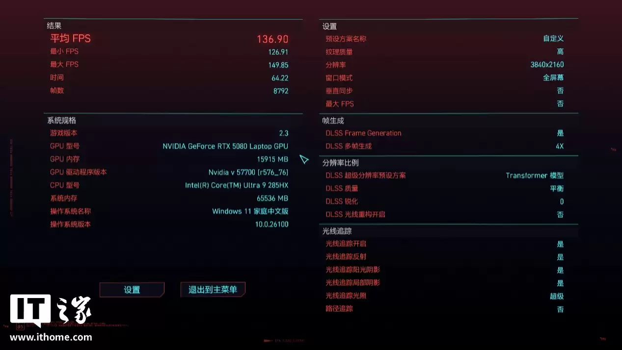《赛博朋克:2077》对游戏本性能的挑战也非常大,即使不开启光追,只选择超级画质,4K 分辨率下游戏平均帧数也只有 46 帧,切换到 2K 分辨率后游戏平均帧数才能达到 100 帧以上。