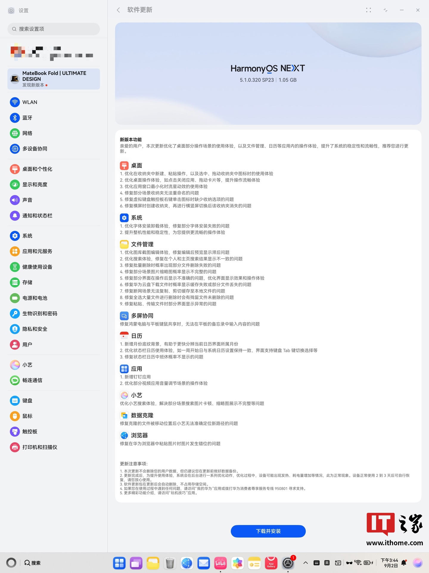 9 月 2 日消息,华为 MateBook Fold 非凡大师折叠笔记本现已开启鸿蒙 HarmonyOS 5.1.0.320 SP23 版本升级,系统包大小约 1.05GB。本次更新优化了桌面部分操作场景的使用体验,以及文件管理、日历等应用内的操作体验,提升了系统的稳定性和流畅性。