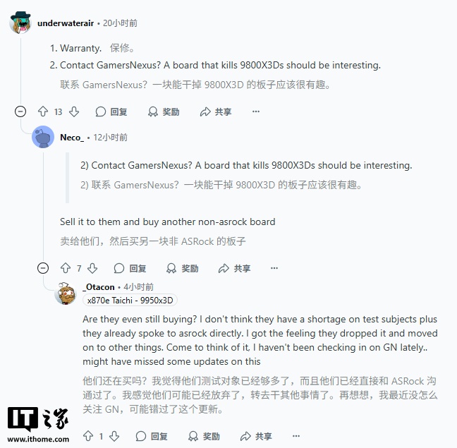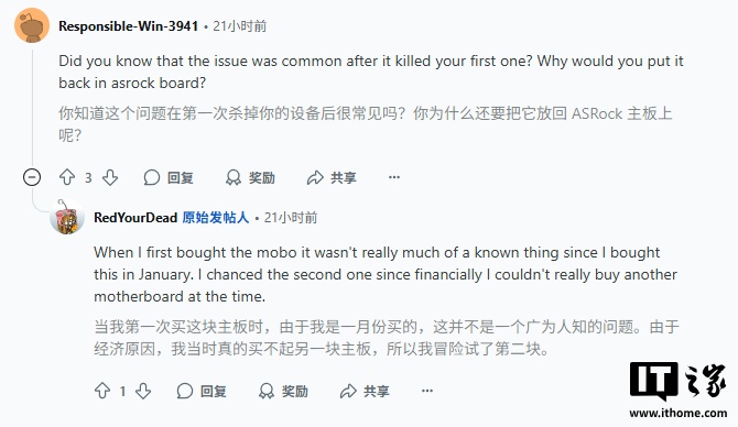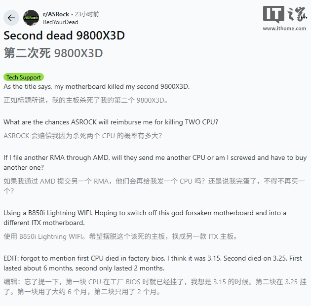 Reddit 用户 @RedYourDead 发帖称,其 R7 9800X3D 处理器在华擎 B850i Lightning WiFi 主板上先后两次损坏,相当倒霉。