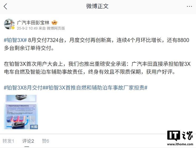 8 月 27 日,广汽丰田宣布向铂智 3X 新老用户做出重大承诺:厂家担责自燃和智能泊车,为新老用户提供终身“自燃险”和“泊车险”。