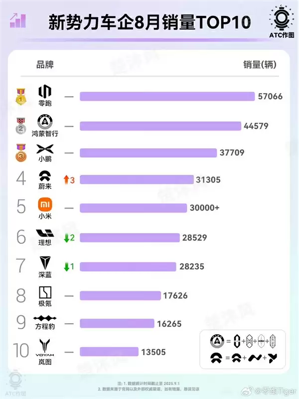 8月新势力销量榜:零跑持续领跑,蔚来增速最快