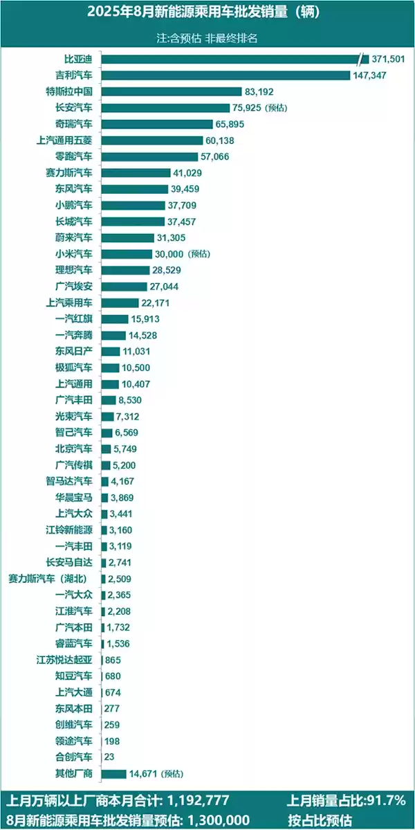 从具体车企销量来看,比亚迪依旧稳坐头把交椅,8月新能源乘用车销量为371501辆。