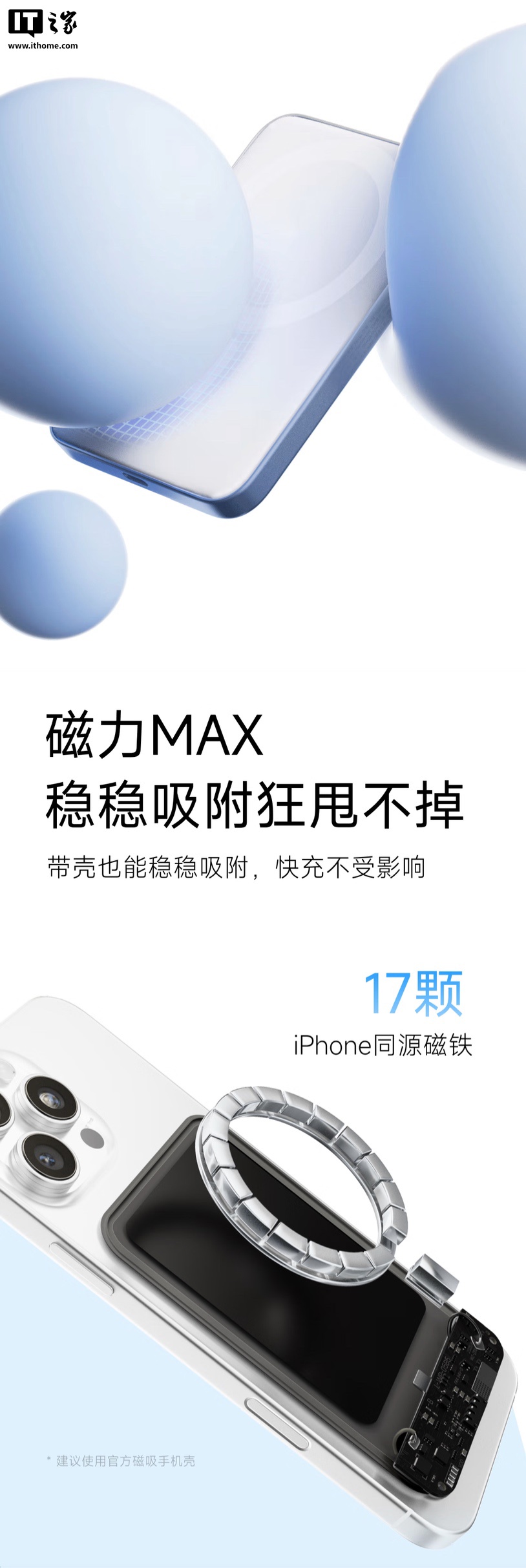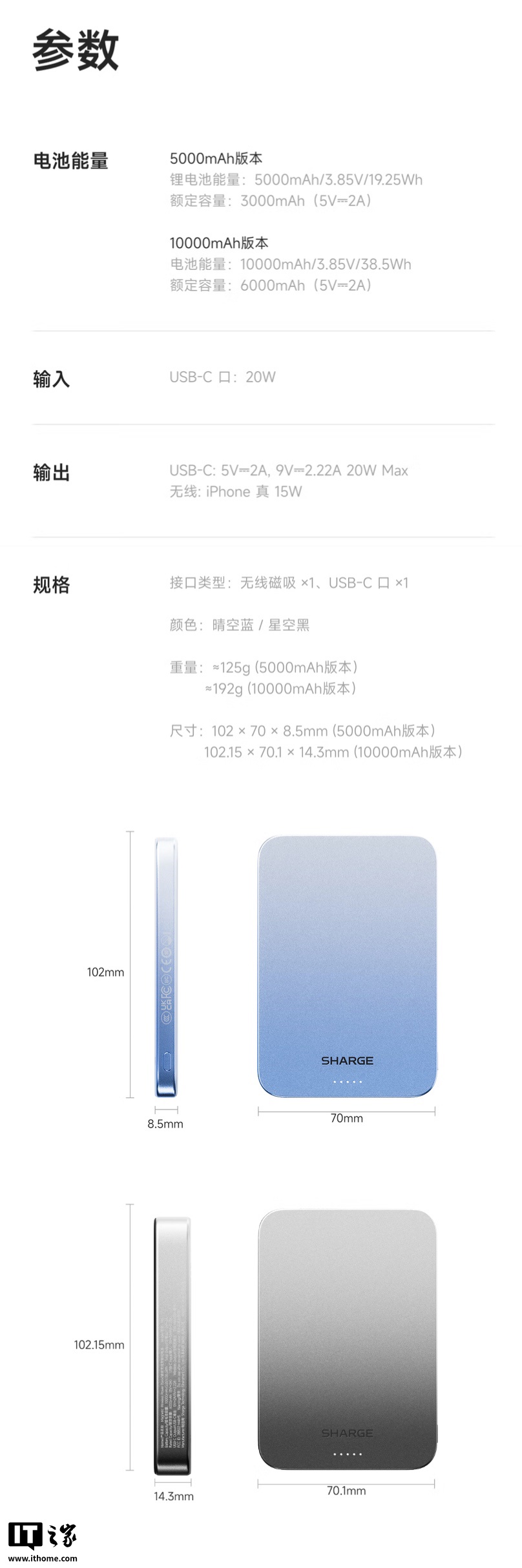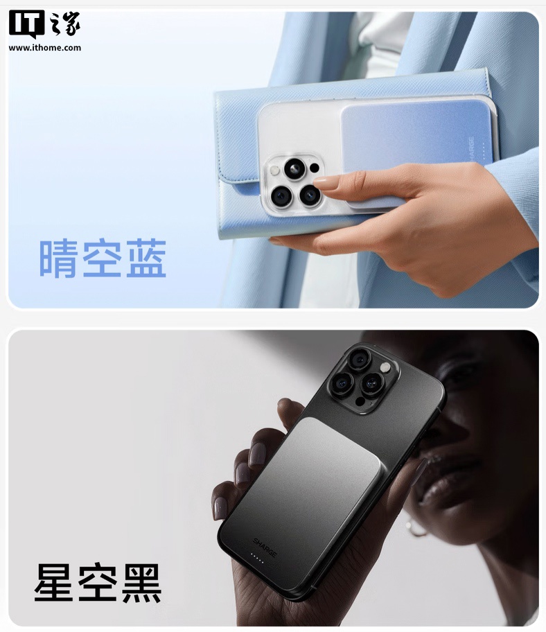 系列移动电源可选晴空蓝 / 星空黑两种配色,5000mAh 款厚度 8.5cm,10000mAh 款为 14.3mm,磁吸面采用液态硅胶材质,内置 17 颗磁铁,支持 15W 磁吸无线充电和 20W USB-C 有线输入输出。