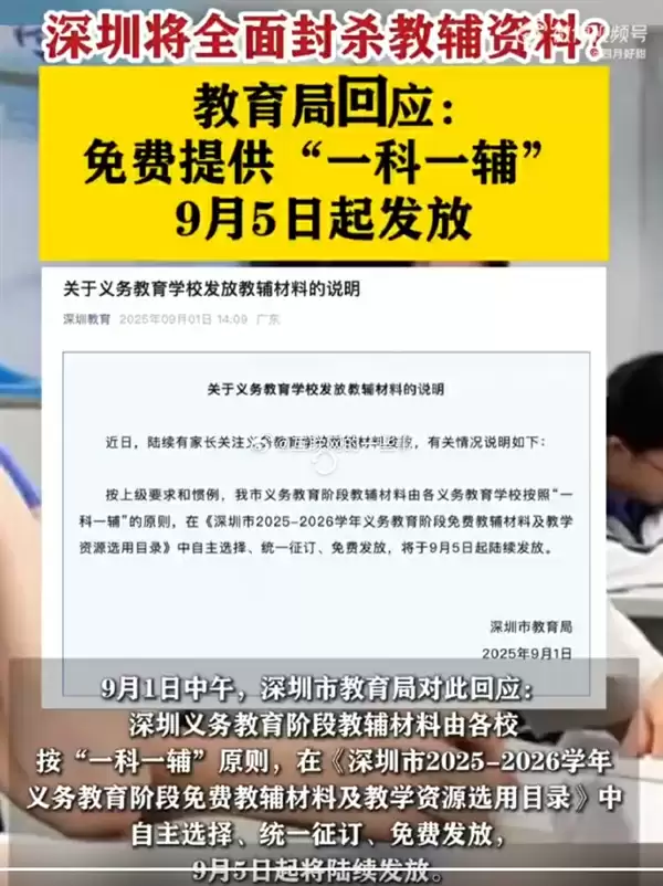 根据上级规定及相关惯例,深圳市义务教育阶段教辅材料将继续由各校严格遵循"一科一辅"原则,在《深圳市2025-2026学年义务教育阶段免费教辅材料及教学资源选用目录》范围内自主选用、统一征订、免费发放,计划自9月5日起陆续配发至学生手中。