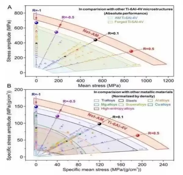 实验结果表明,这种具备全面抗疲劳特性的钛合金在不同应力比的疲劳测试中,“比疲劳强度”全面超越现有所有金属材料,展现出前所未有的综合性能表现。