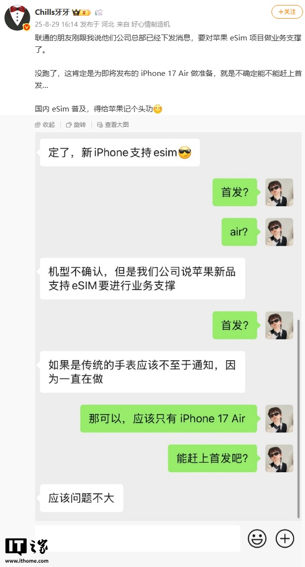 9 月 3 日消息,数码博主 @Chills 牙牙 8 月 29 日爆料称,近期中国联通总部已经下发通知,要对苹果 eSIM 项目进行业务支撑。