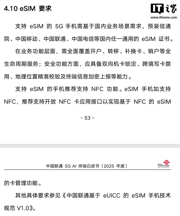 另外中国联通还提到,支持 eSIM 的手机推荐支持 NFC 功能。eSIM 手机如支持 NFC,推荐支持开放 NFC 卡应用接口以实现基于 NFC 的 eSIM 的卡管理功能。