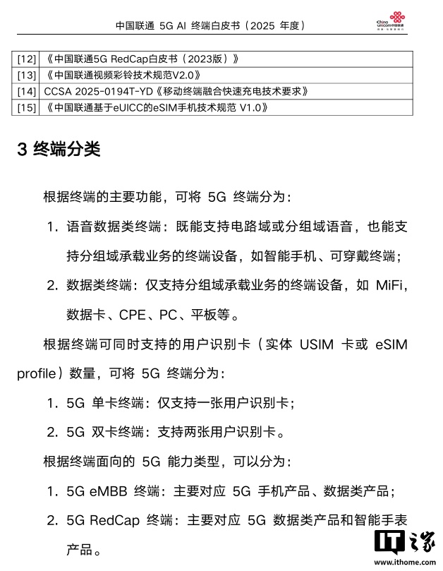 查询发现,中国联通今年 7 月发布了最新的 5G AI 终端白皮书(2025 年度),更新了频段、5G 载波聚合、卫星通信、eSIM、AI 功能、核心网漫游,运营商服务 logo、VoWiFi、RedCap 智能手表速率等方面的信息。