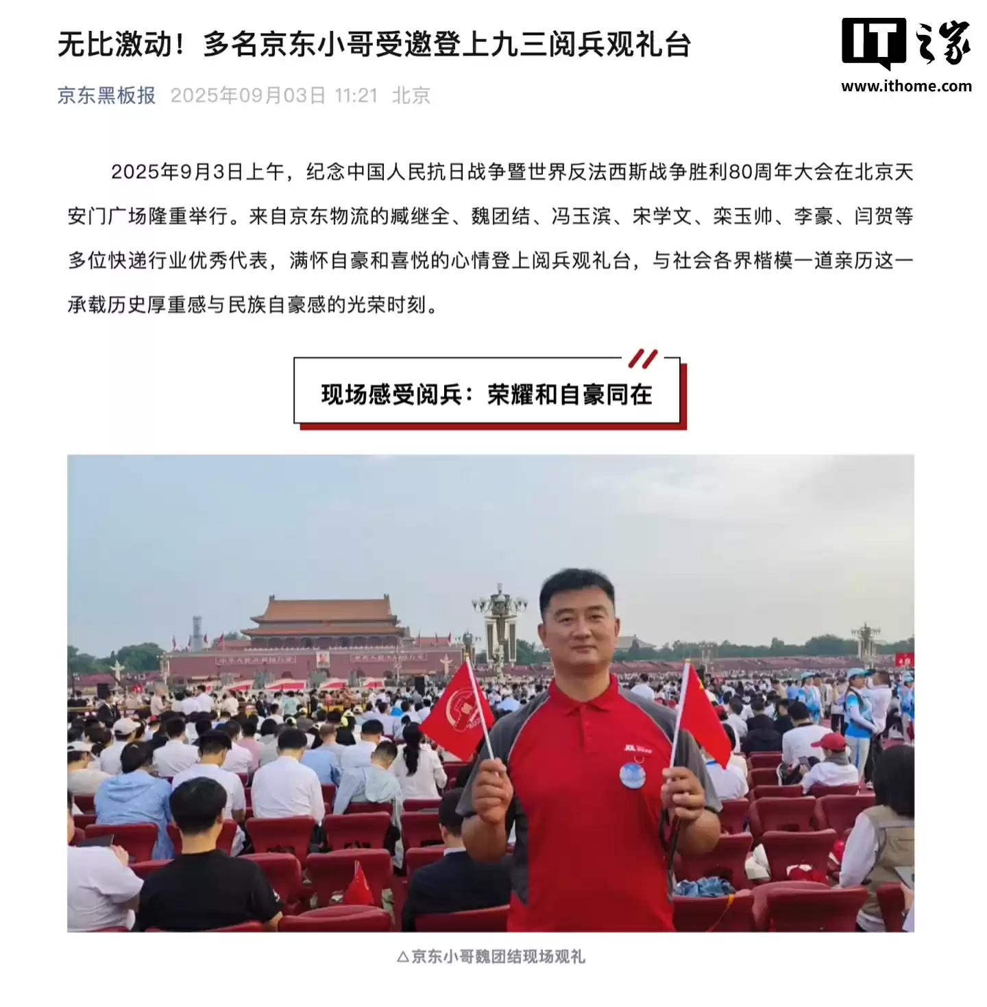 9 月 3 日消息,2025 年 9 月 3 日上午,纪念中国人民抗日战争暨世界反法西斯战争胜利 80 周年大会在北京天安门广场隆重举行。从京东、美团、顺丰方面获悉,多名快递小哥、外卖骑手受邀参加观礼。