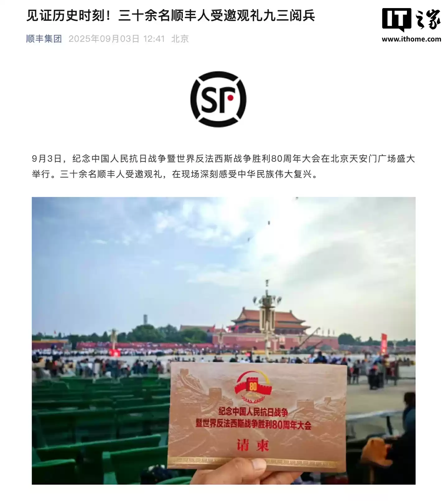 顺丰集团表示,三十余名顺丰人受邀观礼,在现场深刻感受中华民族伟大复兴。其中,快递小哥刘阔曾作为基层工作代表参加过新中国成立 70 周年庆典活动,今年的九三阅兵他也在观礼之列。参加观礼的还有北京顺丰速运基层片区经理、全国劳动模范王俊超,以及北京顺丰党委书记卢萍、全国人大代表及全国道德模范汪勇等。