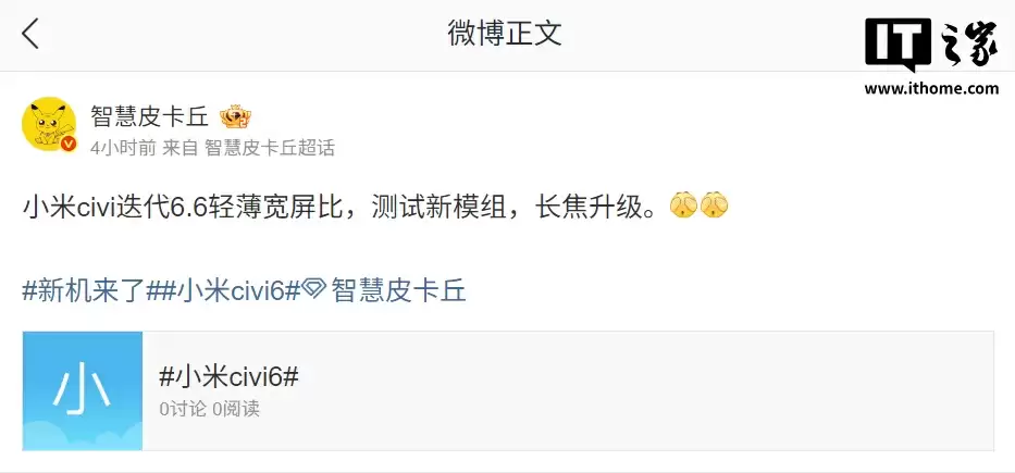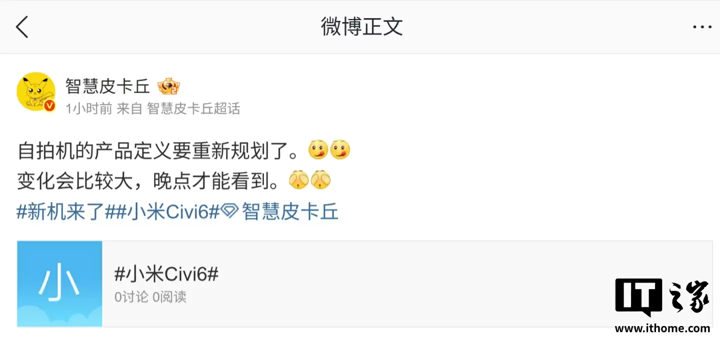 博主表示,这台手机的变化“会比较大,晚点才能看到”,结合博主文中 Tag 暗示和评论区猜测,预计这款手机是小米 Civi 6。