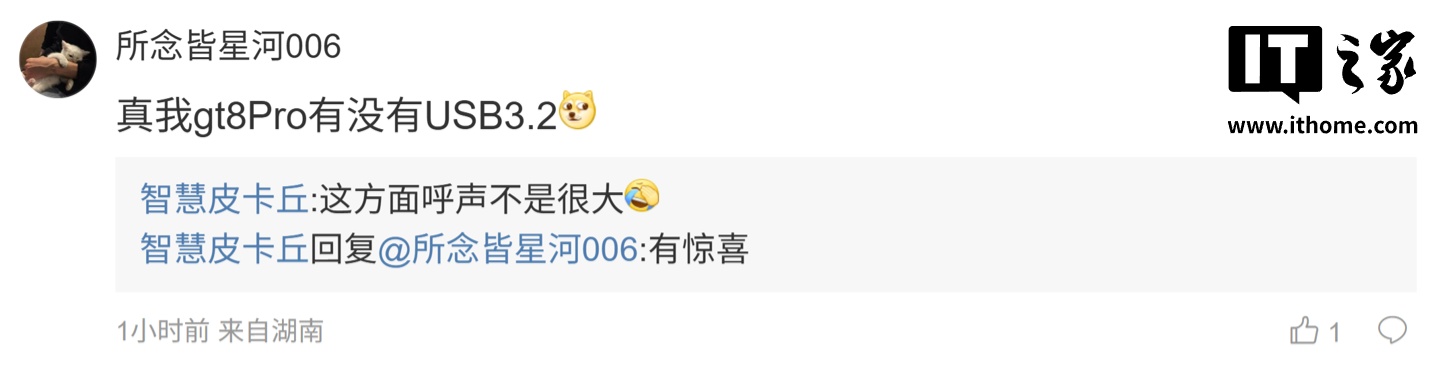 后续有用户在评论区表示:“确实该变变了,一直不温不火的”,博主回复道:“”;另一名用户则询问道:“真我 GT8 Pro 有没有 USB 3.2”,博主则回复道:“这方面呼声不是很大