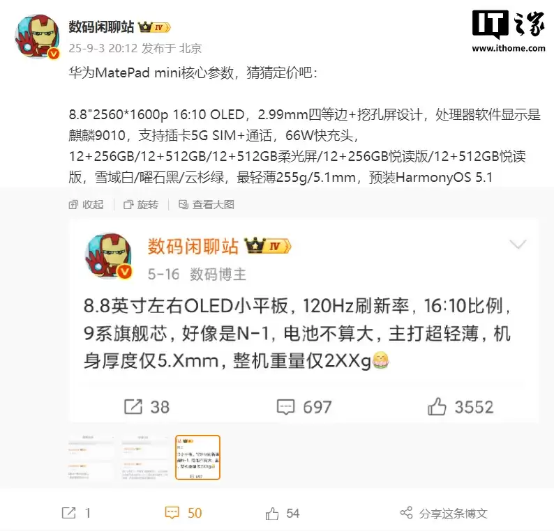 博主 @数码闲聊站 今日爆料了该小平板的核心参数: