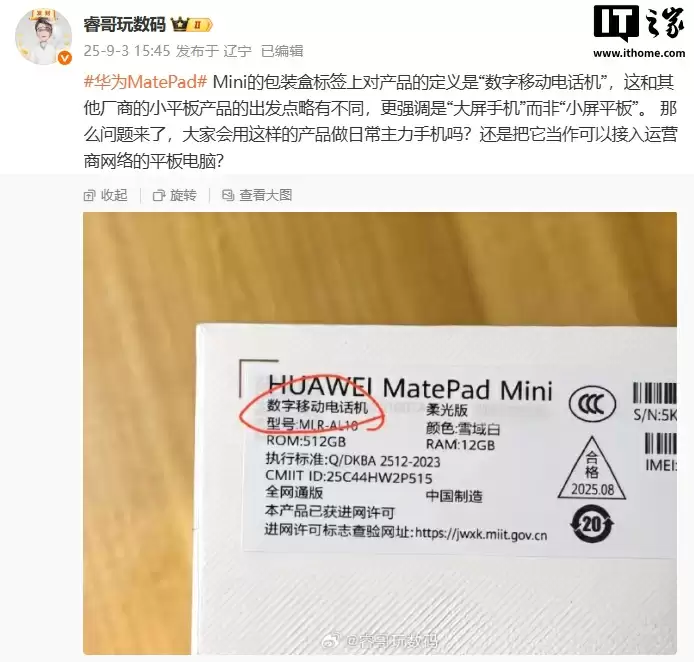 注意到,博主 @睿哥玩数码 今日分享了这款平板的包装盒照片,标签页显示新品为“数字移动电话机”,更印证了宣传海报中的“大手机”这一卖点。