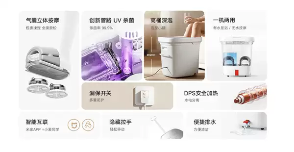 其他方面,该足浴器支持小米澎湃智联,支持米家App远程操控、小爱同学语音指令,一体式精研按摩机芯,免拆快洗,配备可伸缩隐藏拉手和万向轮,无管直排出水、智能大屏。
