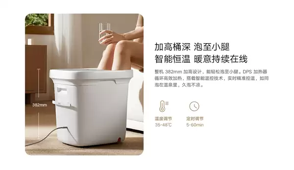 整机382mm加高设计,可泡至小腿,温度调节范围为35-48℃,支持智能温控技术,久泡不凉。