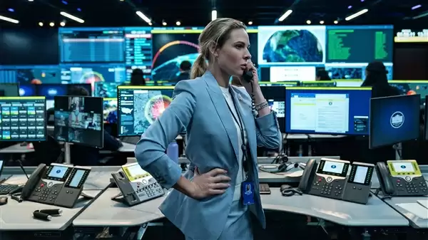 新片演员阵容强大:黑人影星伊德瑞斯·艾尔巴(图一中)扮演美国总统;丽贝卡·弗格森(图一右)扮演驻守华盛顿的军方联系人奥莉薇娅上尉;安东尼·拉莫斯(图二左)扮演驻守阿拉斯加的反导部队指挥官冈萨雷斯少校;格蕾塔·李(图二中)扮演国家安全局专家。