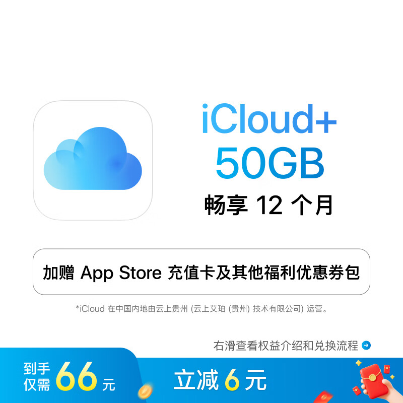 50GB 每月 6 元(每年 72 元),9 折后年卡 64.8 元,低至 5.1 元 / 月。