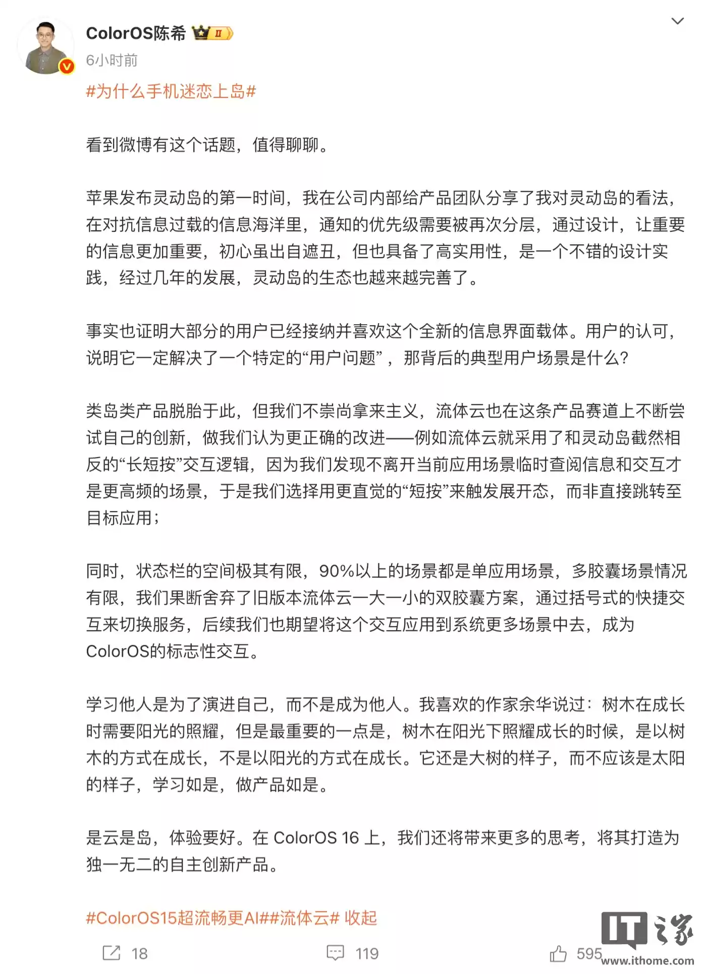 9 月 4 日消息,OPPO ColorOS 设计总监陈希今天下午在微博发文谈“为什么手机迷恋上岛”,其表示,看到微博有这个话题,值得聊聊。