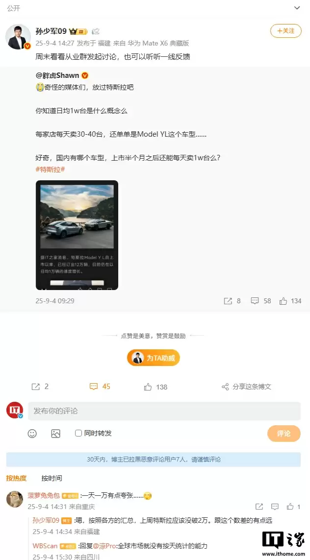 然而市场观察人士对此数据持有不同看法。汽车行业分析师@孙少军09在微博发文表示:"根据多方汇总的销售数据,特斯拉上周的实际销量应该没有突破2万辆,与官方公布的数字存在明显差异。"