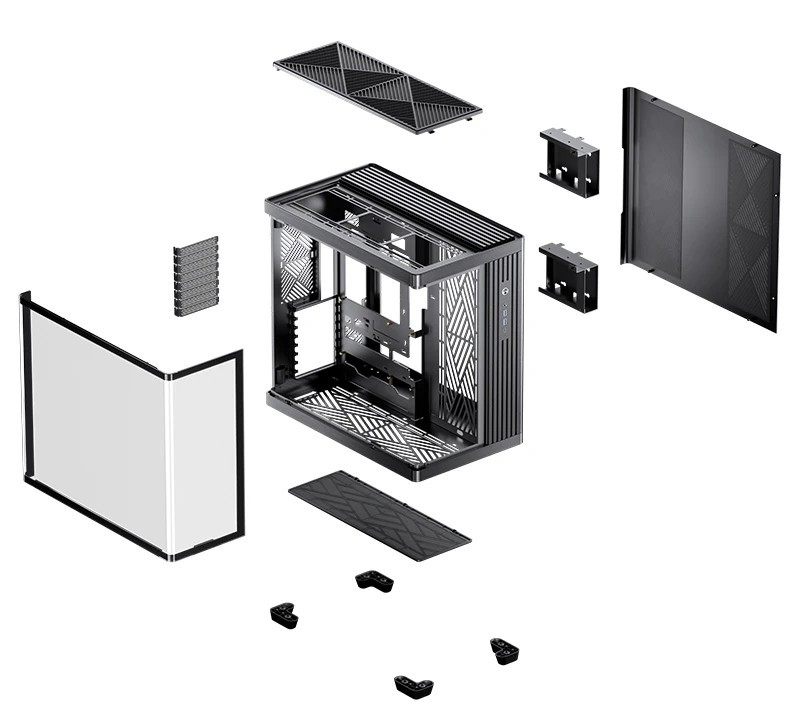TK-4 机箱三维 495×298.6×495 (mm),采用 1.0mm 的 SGCC 钢板和 4mm 玻璃,侧板、后窗、上下饰条则为铝合金材质,WOOD 版本顶板和前板分别配备 8mm / 16mm 厚度的北美黑胡桃木。