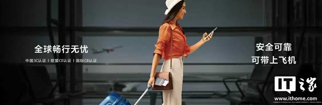 安全方面,该移动电源拥有中国 3C 认证、欧盟 CE 认证、国际 CB 认证,可带上飞机。
