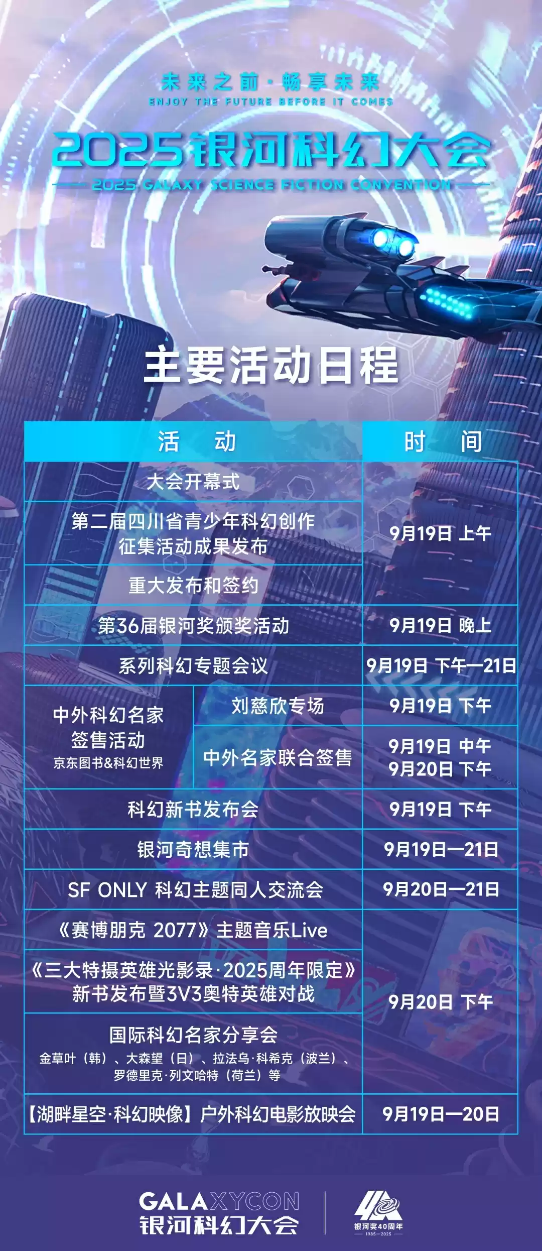 同时,大会还将举办银河奇想集市,包括银河奖四十周年纪念展、AI 探索俱乐部、SF ONLY 科幻主题同人交流会、《三大特摄英雄光影录・2025 周年限定》新书发布暨 3V3 奥特英雄对战表演、《赛博朋克 2077》主题音乐 Live、【湖畔星空・科幻映像】户外科幻电影放映会等,以及科幻作家进校园活动等,附日程如下: