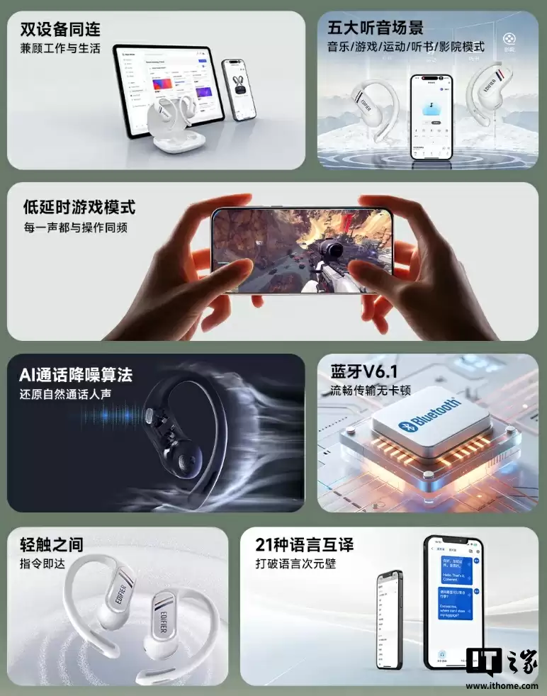 漫步者 Comfo SE 还搭载蓝牙 6.1,支持双设备同连、低延时游戏模式、AI 通话降噪、21 种语言互译等。