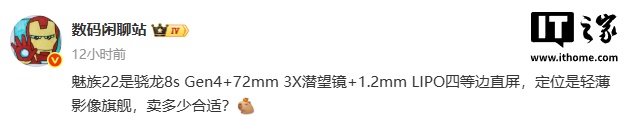 9 月 4 日消息,博主 @数码闲聊站 昨日爆料称,魅族 22 手机搭载骁龙 8s Gen4+72mm 3X 潜望镜 + 1.2mm LIPO 四等边直屏,定位是轻薄影像旗舰。