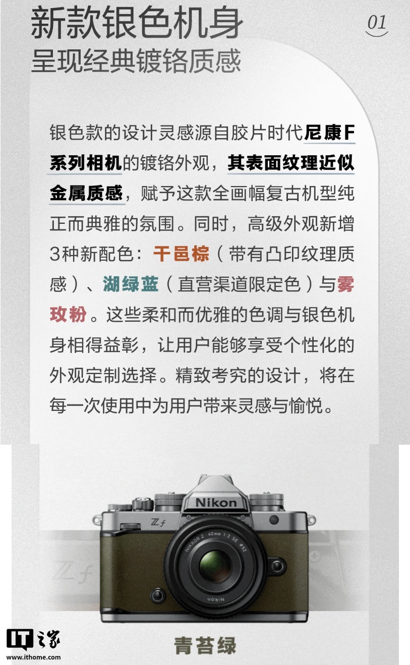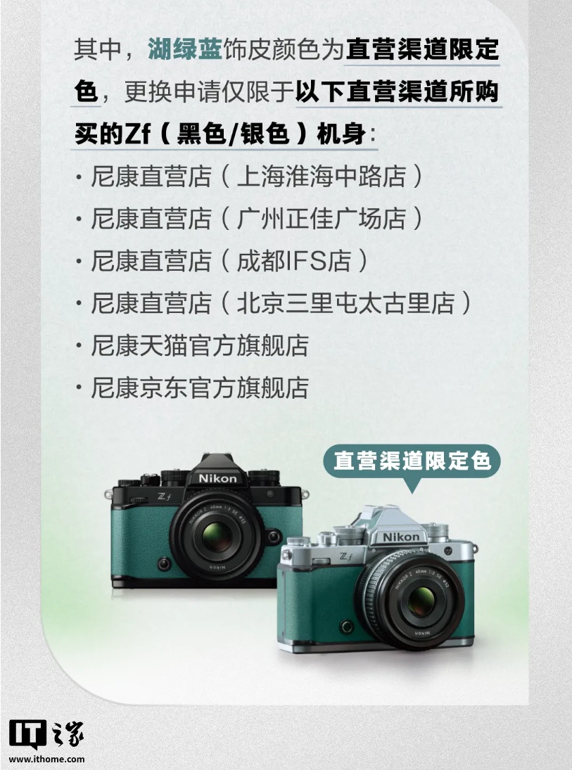 注意到,本次 Z f 还新增了干邑棕、湖绿蓝、雾玫粉高级外观配色, 其中湖绿蓝是直营渠道限定,用户只可在尼康线下直营店、京东 / 天猫官方旗舰店购买到这种配色的机身。