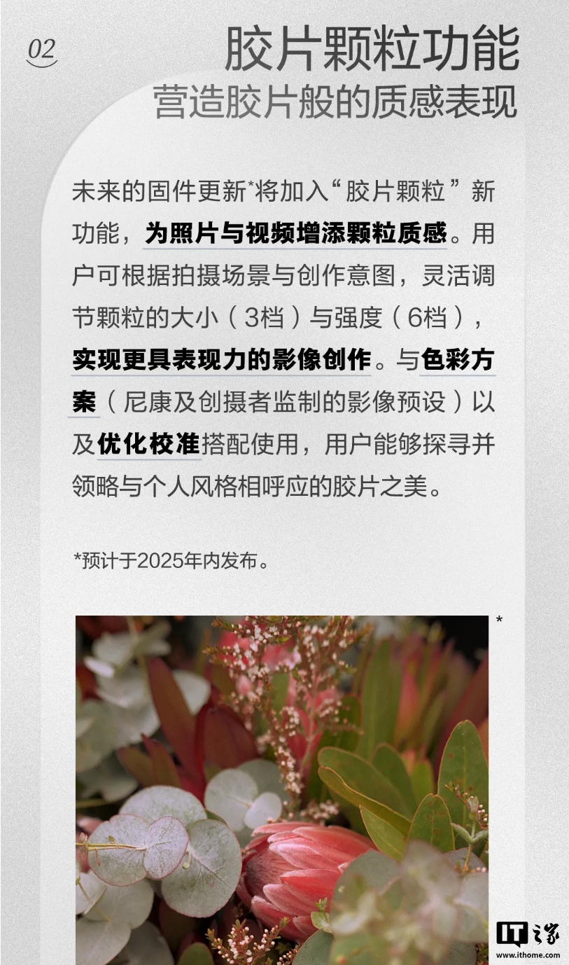 尼康还宣布尼康 Z f 未来将在固件中加入“胶片颗粒”滤镜,可为照片和视频增加颗粒质感,用户可灵活调节 3 档颗粒大小、6 档颗粒强度,可以与色彩方案、优化校准配合使用,实现更有表现力的创作,本滤镜预计 2025 年内发布。
