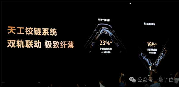 它采用了天工铰链系统,支持双轨联动,内嵌一体连杆和嵌入式滑动弧臂,内、外转轴厚度相比传统折叠机分别降低16%和23%。