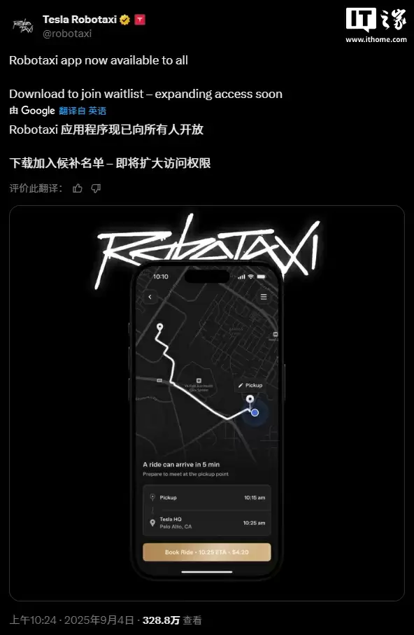 据悉,该推文附带了苹果App Store的应用下载链接,并提示用户可通过安装应用加入服务等候队列。此次全面开放与特斯拉CEO埃隆・马斯克早前承诺的时间表吻合,他曾在公开场合表示该应用将在9月面向大众推出。