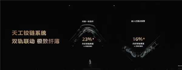 他介绍,华为能做到三折叠,主要来源于精巧的天工铰链系统,实现超薄大屏内外弯折,通过双轨联动来实现折叠,而且转轴厚度相较于传统折叠屏大大降低。