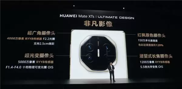 影像能力是这次华为Mate XTs非凡大师的主要升级亮点之一,拥有4000万像素RYYB传感器、F2.2光圈且支持2.5cm微距的超广角摄像头;5000万像素RYYB传感器、F1.4-F4.0十档物理可变光圈并配备OIS的超光变摄像头;150万多光谱通道、色彩还原度提升120%的红枫原色摄像头;以及1200万像素RYYB传感器、支持5.5倍光学变焦且配备OIS的潜望式长焦摄像头。
