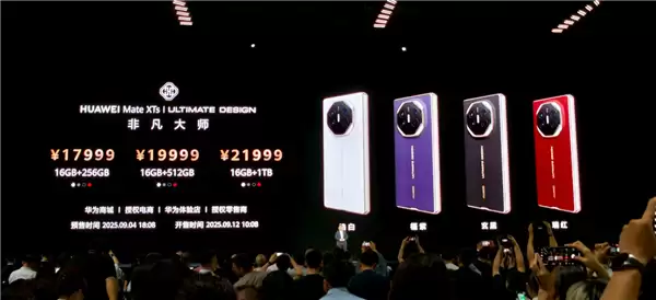 价格方面,华为Mate XTs非凡大师相比上一代略低一些,提供三种配置:16+256GB 17999元、16+512GB 19999元、16GB+1TB 21999元。