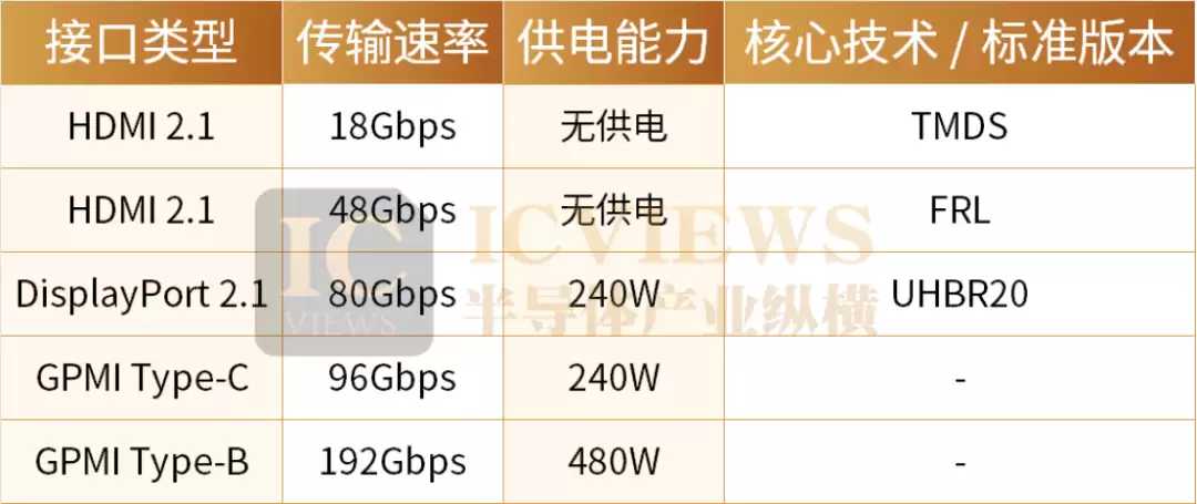 以下是GPMI和HDMI 2.1及DisplayPort 2.1的规格比较: