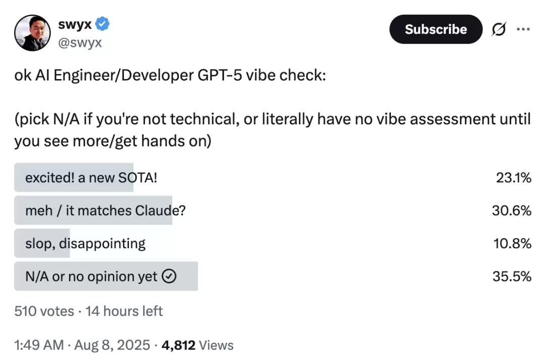 在 GPT-5 发布后的第二天,AI 工程专家 Shawn Wang(又名 swyx)在 X 上进行了一次民意调查,超过 40% 的人认为它“一般”或“糟糕”。当然,这不是很严谨,但也确实表明,OpenAI 对于 GPT-5 编码能力的宣传过于积极。(顺便说一下,Wang 是另一位在 OpenAI 发布日编程中被 OpenAI 展示的开发者。)