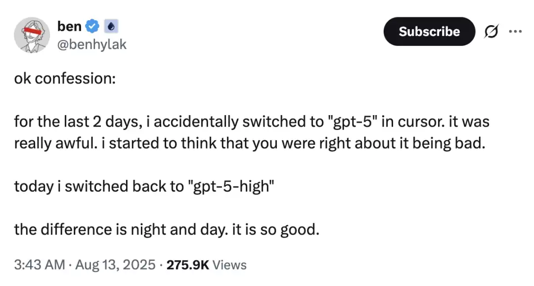 上面提到的 GitHub Pilot 用户可能一直在使用一个不那么强大的 GPT-5 版本,就像 Hylak抱怨Cursor 里的“gpt-5”。