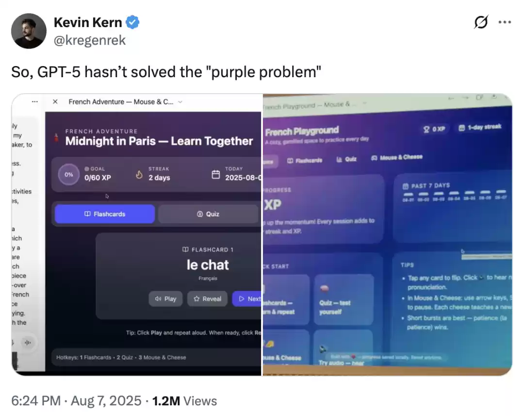 也有一些有趣的反应。在 X 上,AI 开发者 Kevin Kern 开玩笑说,GPT-5 对紫色的偏好说明它生成的前端设计并不那么具有原创性。