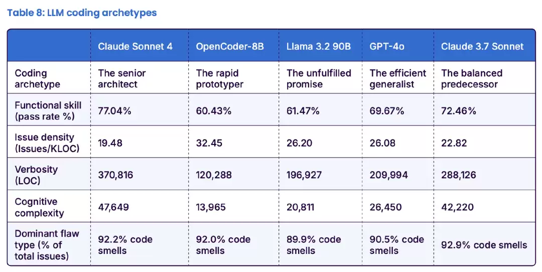 还有一点值得指出的是,编码 LLM 似乎都有不同的风格或者“编码个性”——这是代码安全公司 Sonar 本周发布的 一项新研究。Sonar 的研究称,GPT-4o 是一位“高效的全才”,而 Claude Sonnet 4 则是一位“资深架构师”。