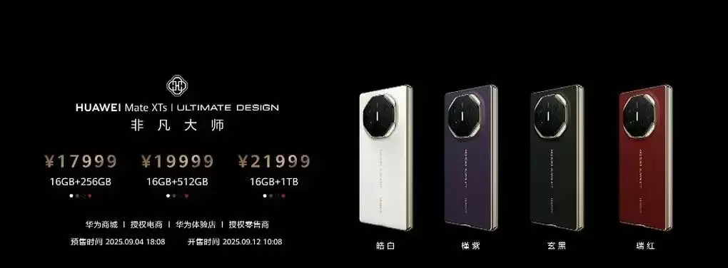 相比去年 Mate XT 非凡大师 19999 元至 23999 元的起售价,Mate XTs 全系下调了2000元,具体定价为:16G+256G 版本 17999 元,16G+512G 版本 19999 元,16G+1TB 版本 21999 元。