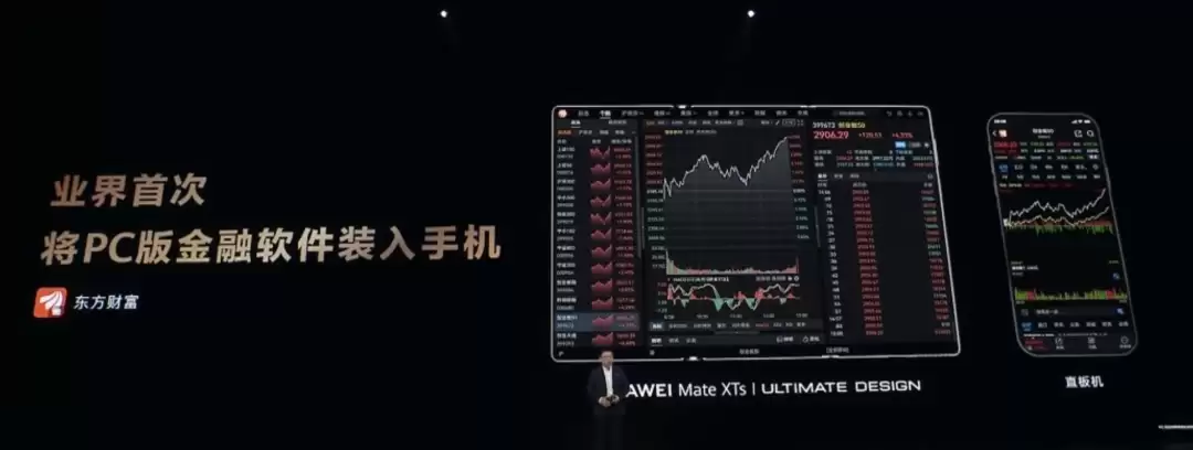 华为终端BG董事长余承东在发布会上特别提到,三折叠屏堪称“炒股神器”,大屏非常适合查看股市行情,甚至祝福用户“炒股赚钱”。这一应用场景得到进一步拓展,华为首次预装了PC版的东方财富、万兴脑图、WIND金融等专业软件,结合自由多窗和全景多窗模式,实现高效的移动办公与看盘体验。