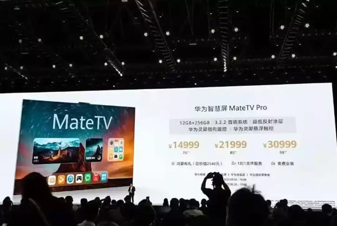 MateTV标准版(8+128GB)提供四种尺寸:65英寸8999元、75英寸11999元、85英寸15999元、98英寸24999元。MateTV Pro版(12+256GB)则有75英寸14999元、85英寸21999元、98英寸30999元三个版本,是本场发布会中最贵单品。