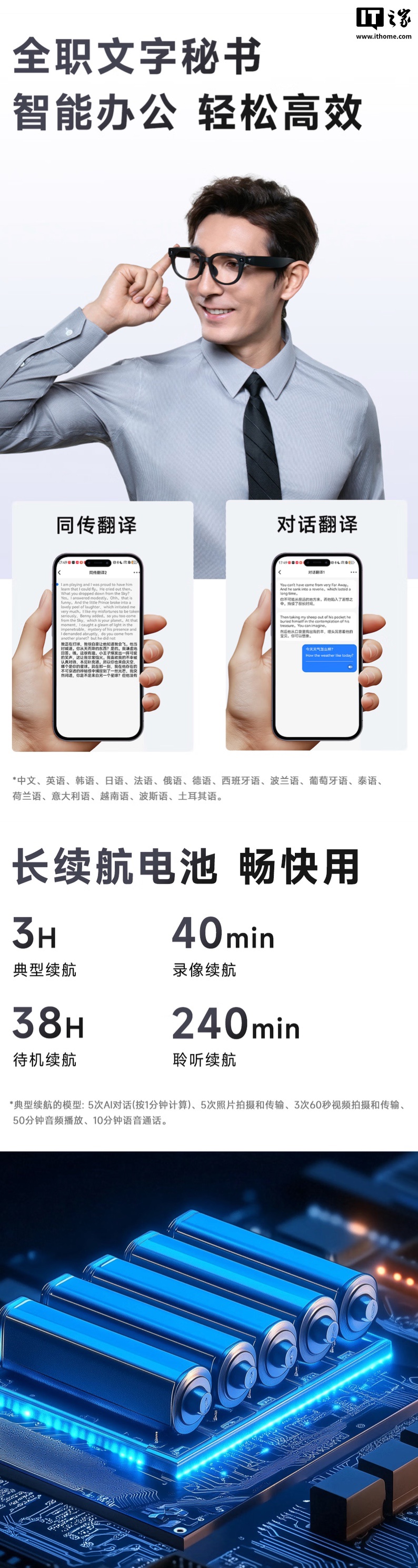 该眼镜配备 12MP IMX681 传感器,支持 Wi-Fi 6 和蓝牙 5.3,提供 IP54 抗水,内置 173 毫安时电池,同时配备 3000 毫安时电量智能充电仓,可以实现 12 次充电。