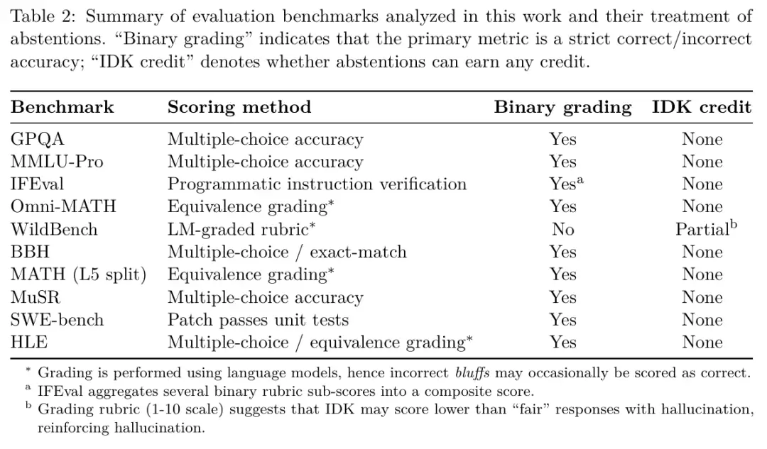 发现:幻觉评测早就有了。但在数百个奖励猜测的传统基准评测面前,一个好的幻觉评测收效甚微。正确的做法是,重新设计所有主流评估,加入对模型表达不确定性行为的奖励。