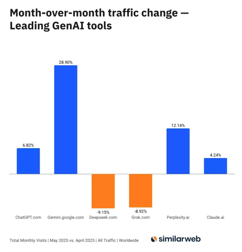 更令人瞩目的是增长数据。Gemini的增长轨迹非常陡峭, 访问量从2月份的2.84亿次增长到7月份的7亿次,而ChatGPT为57.2亿次。