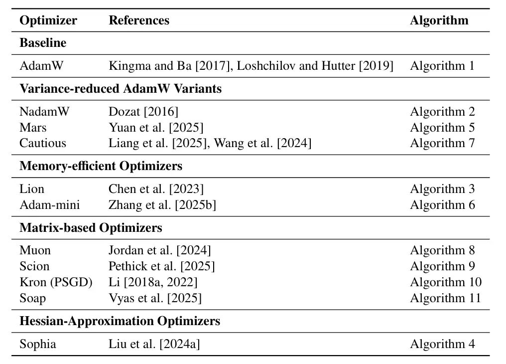 为了验证这一假设,研究人员进行了系统性的比较研究,涵盖了十一种不同的深度学习优化器。他们在多种模型规模(从 1 亿到 12 亿参数)和数据–模型比例(参照 Chinchilla 最优比例的 1 倍至 8 倍)下,为每一种优化器都进行了严谨、独立的超参数调优。