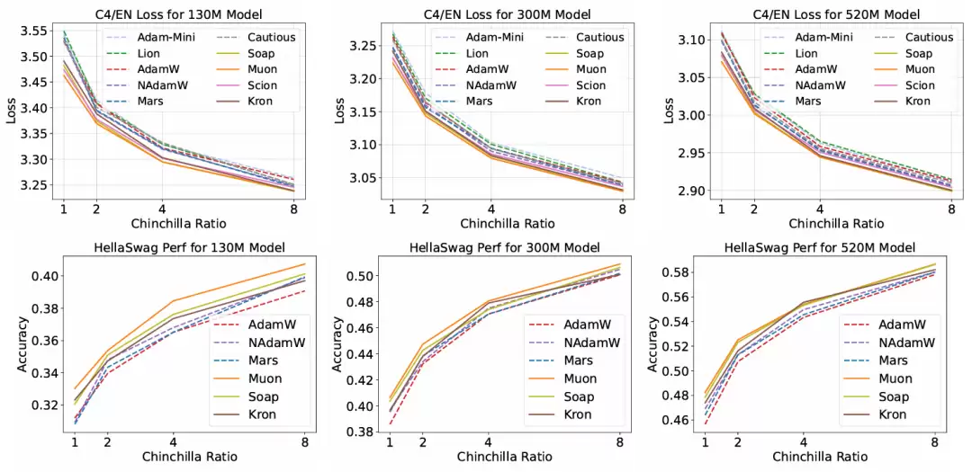 这一阶段的结果进一步揭示了 Muon 优化器的潜在局限性:尽管 Muon 对高达 1.2B 参数的模型仍有加速效果,但加速比会下降到 1.2 倍以下。在高数据与模型比例(如 16 倍 Chinchilla)下,NAdamW 和 Soap 在 130M 模型上超越了 Muon,且 Soap 在 300M 模型上也超过了 Muon。研究推测,在数据与模型比例很高时,Soap 和 Kron 所维持的二阶动量变得更为有效。